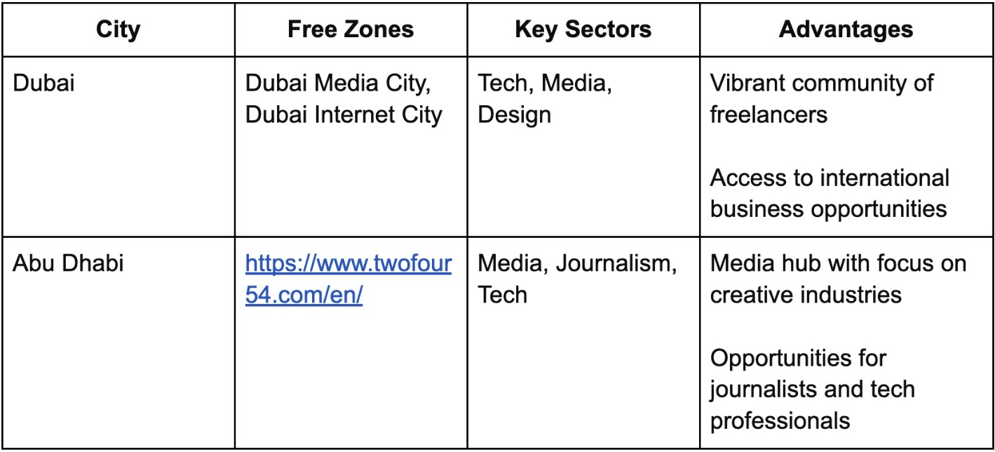 The UAE offers various freelance visa options, each suited for different sectors and professional needs. Below is a breakdown of popular free zones in Dubai and Abu Dhabi, highlighting the key sectors and opportunities available: