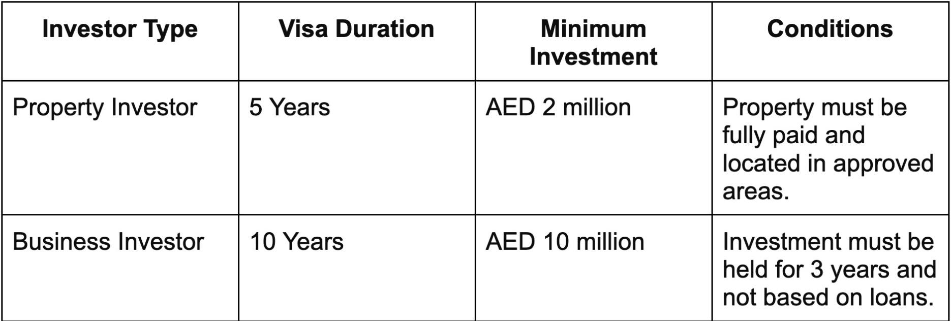 The UAE Golden Visa caters to a wide range of applicants, including investors, professionals, entrepreneurs, and individuals with exceptional talents. Each category has its own requirements and visa duration, providing tailored options for different goals. Below is a detailed breakdown of each category: